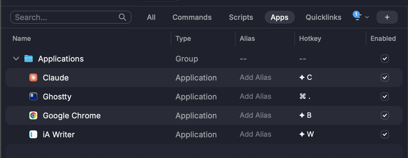 Hyper + B-> Borwser(Chrome)Hyper + C-> ClaudeHyper + W-> Writing tool(iA Writer)