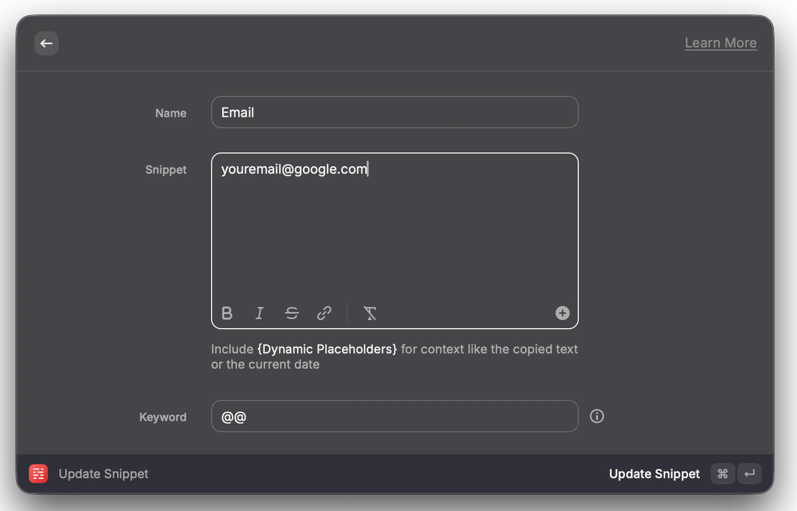 I type my email address dozens of times a day. Instead of typing it out each time, I've set up a snippet in Raycast: when I type @@, it automatically expands to my full email address.